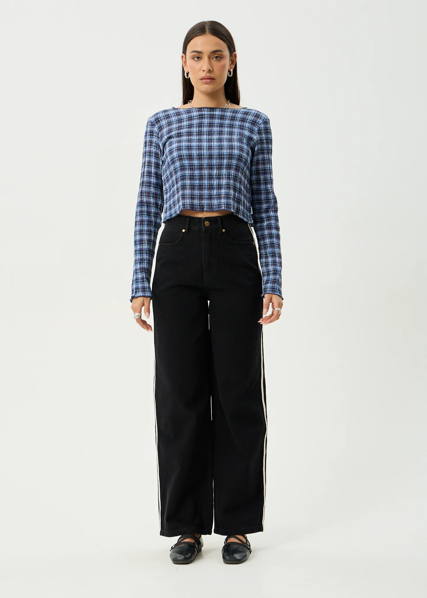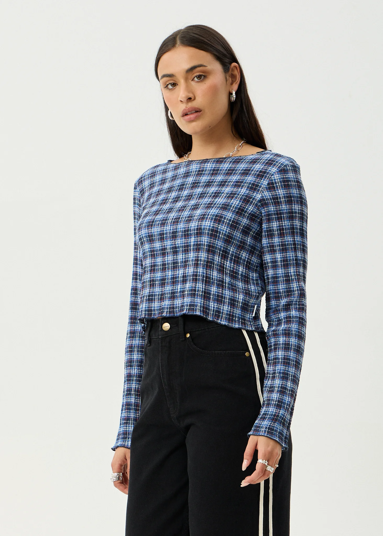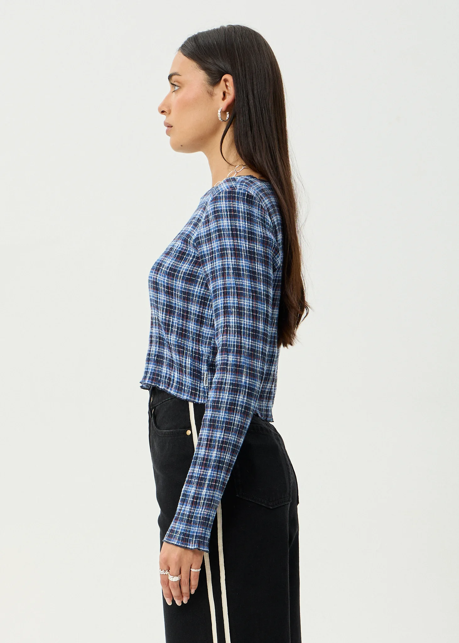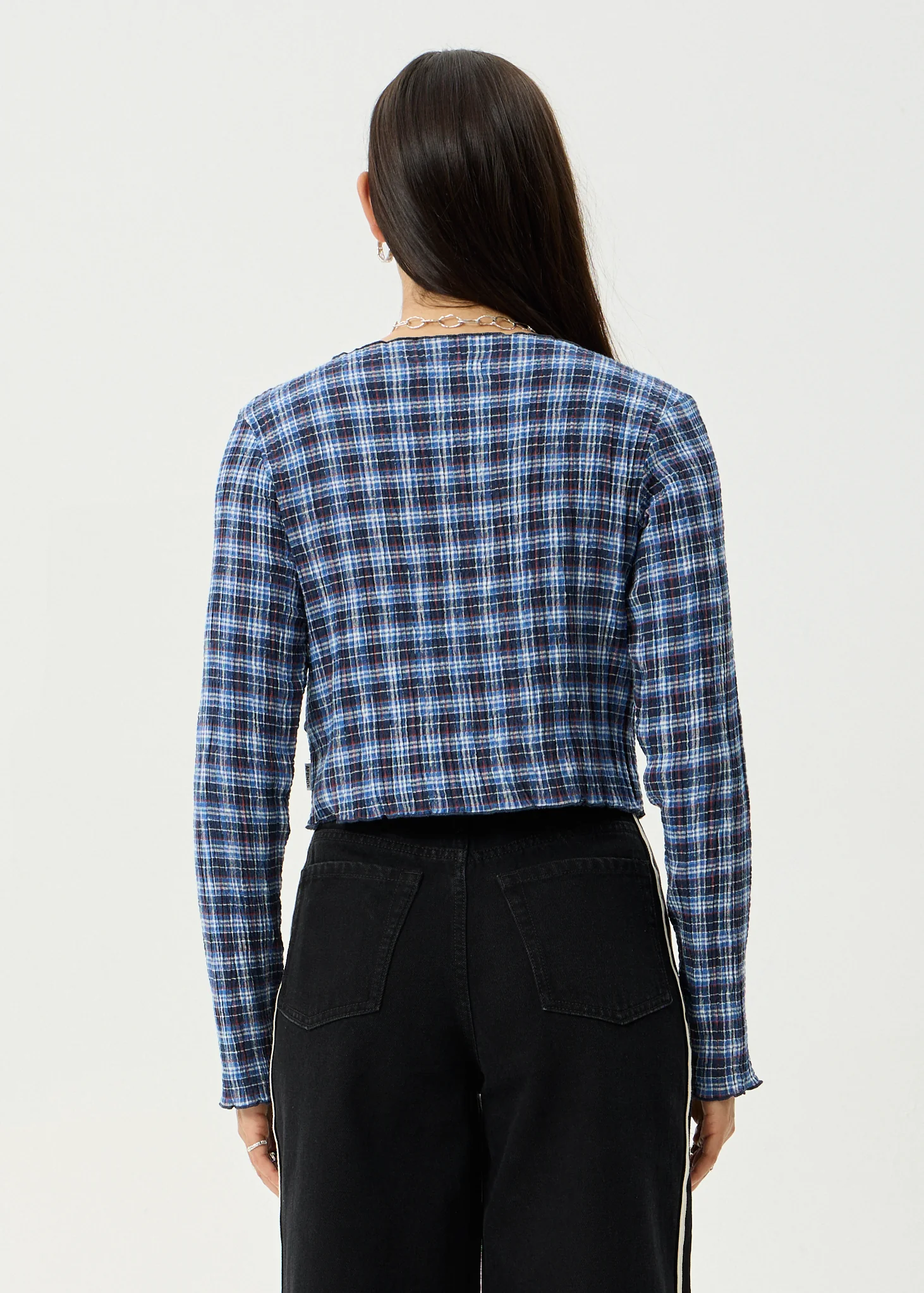 AFENDS Womens Mountains - Seersucker Long Sleeve Top - Navy Red Check